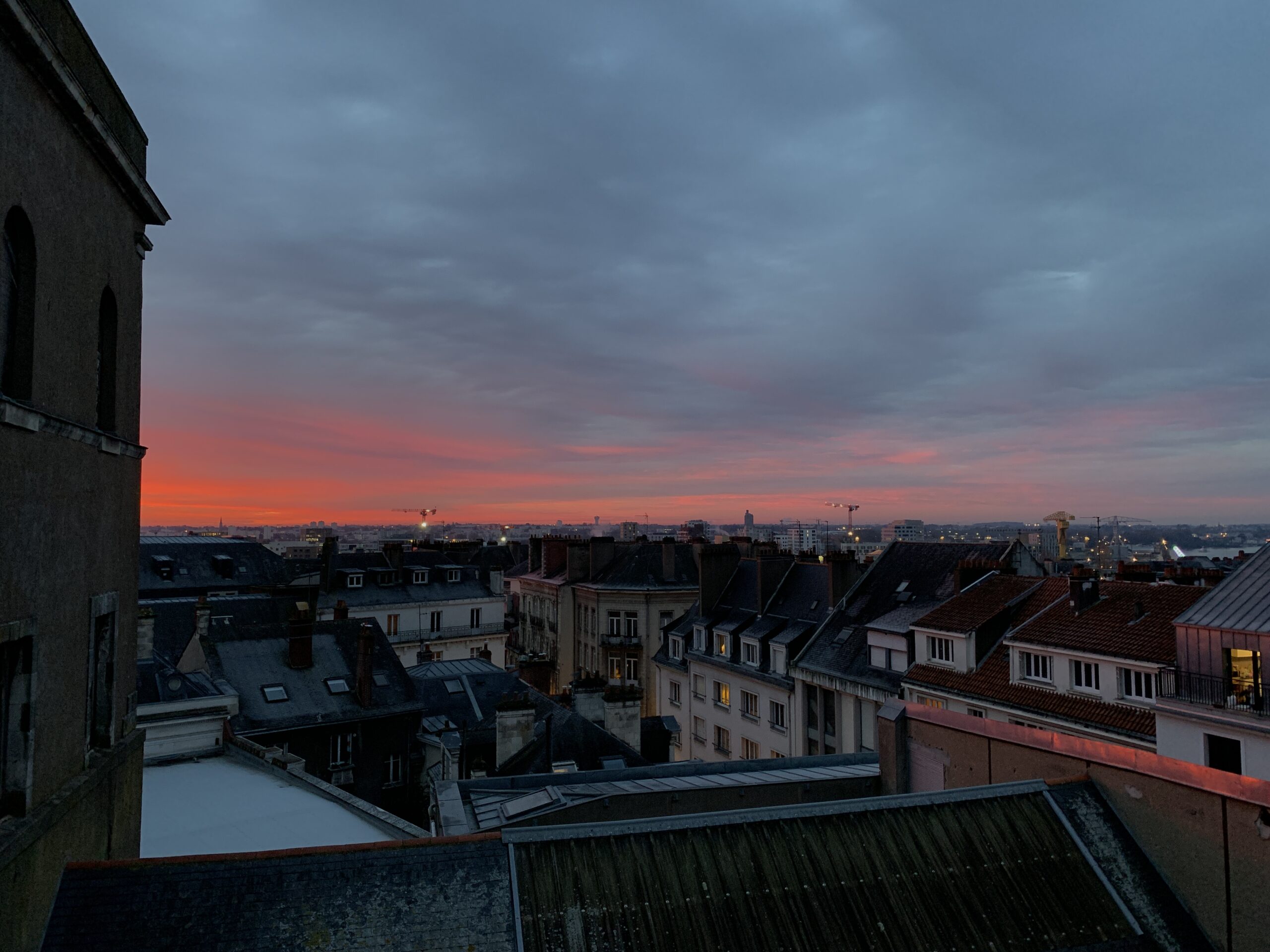 Emménagement, 30 aout 2016. Dans ce joli studio du quartier Graslin, 4eme etage, vue sur les toits et l’ile de Nantes, j’entend presque le hurlement de l’Elephant au loin les jours de beau temps. (La nuit je distingue très bien les anneaux de Buren avec leur lumière vert rouge et bleu)
